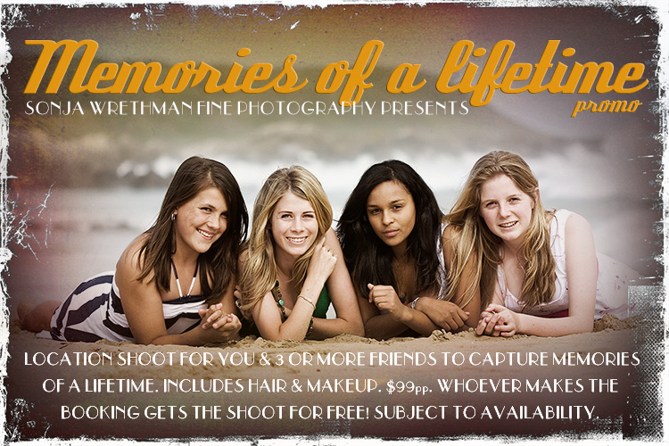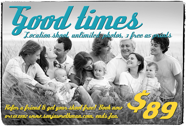 Location shoot for your family and friends & 3 free A5 prints. This is a holiday season promotion – these shoots are usually $299. If you refer another friend or family to book and pay for their shoot before the end of January, you get your $89 back. Wow. Easy as pie. Come on, make some memories! Includes a studio viewing of all the pictures taken from the shoot. Print, digital files, canvases, books and more can be ordered at really reasonable rates.