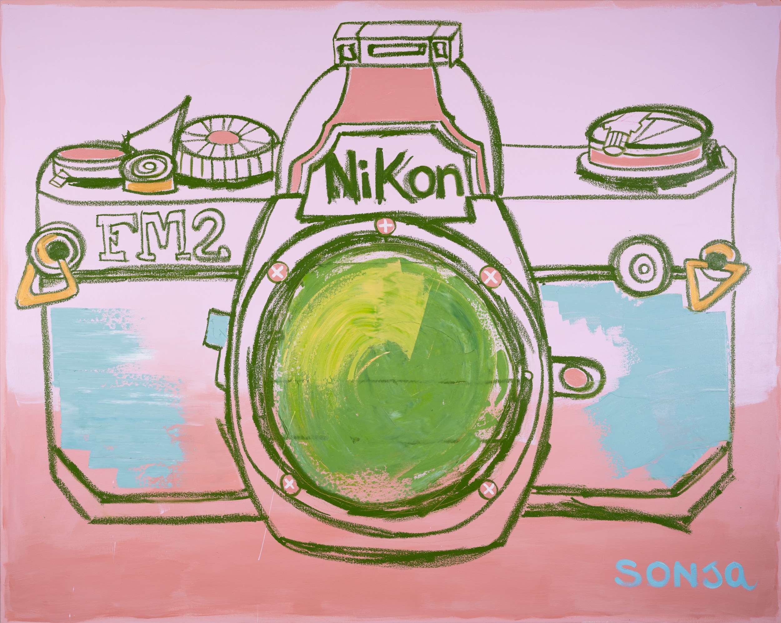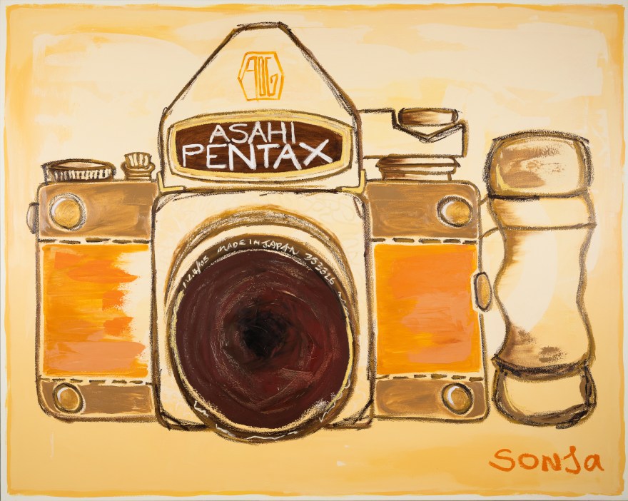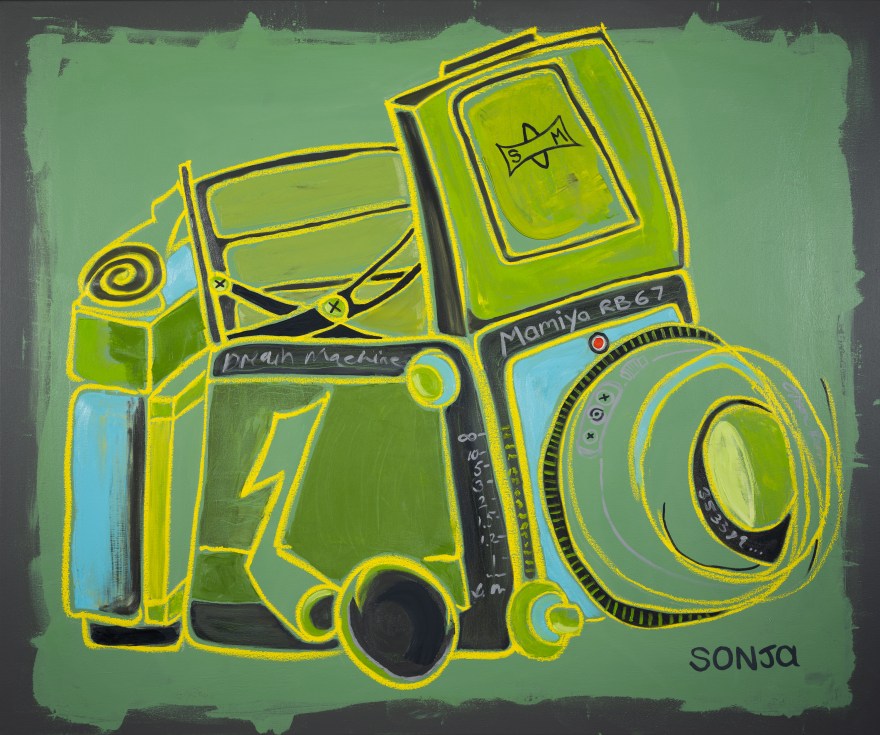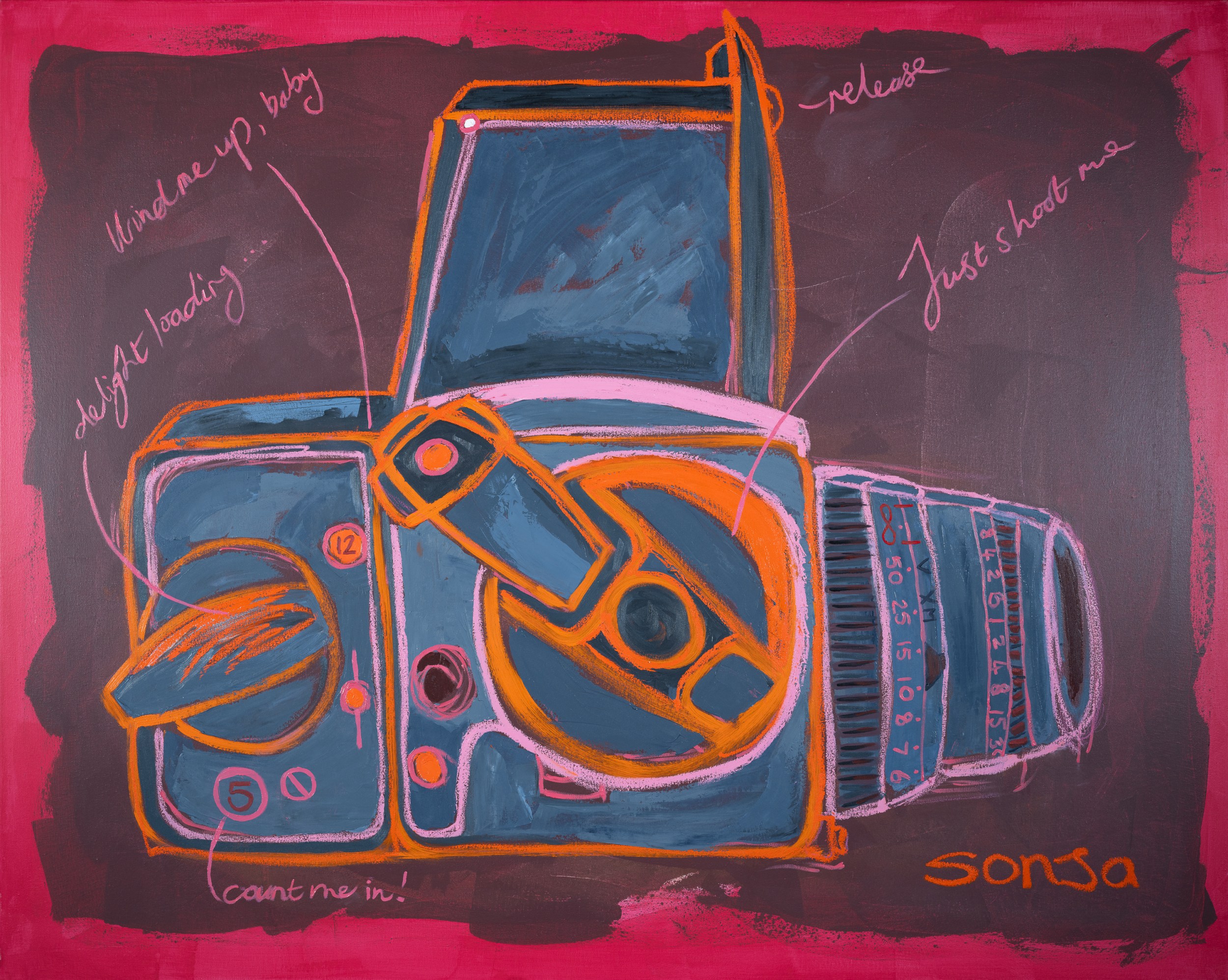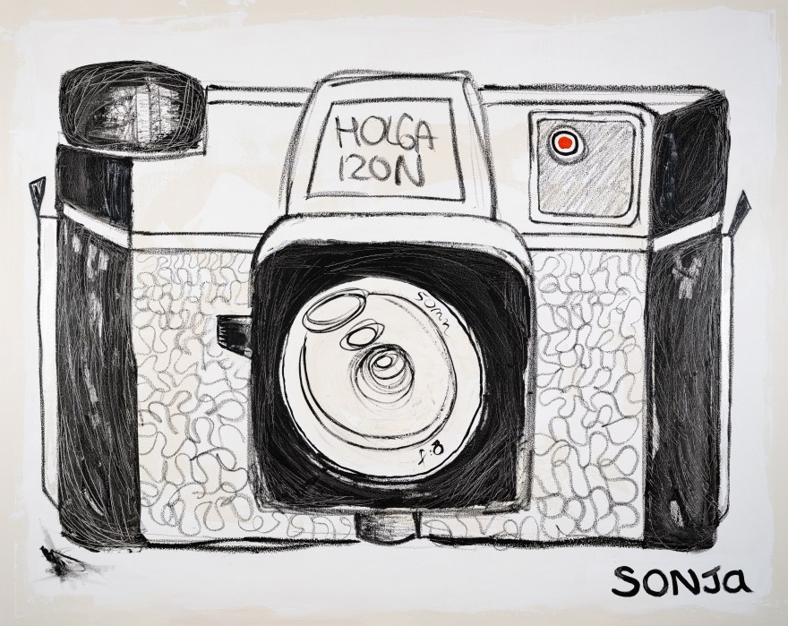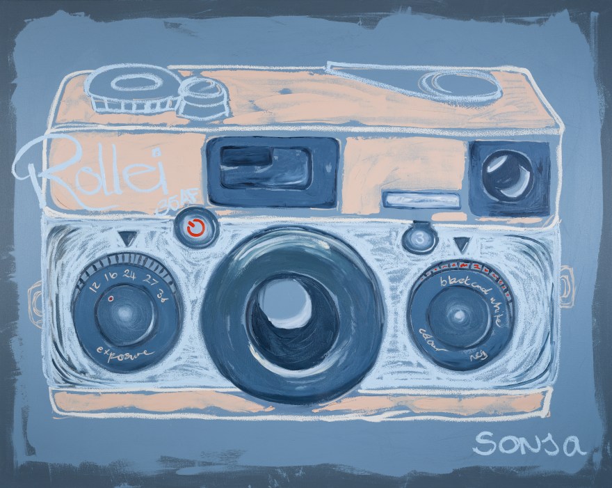Sonja’s current exhibition finds it’s expression in oil on canvas. A lively, energetic rendition of old school film cameras gives us a playful peek into icons of a bygone era where film photography captured the world slowly, spontaneously and with whimsical imperfection. Inspired by vintage cameras, the evocative red glow of the darkroom, and the rough, playful vignettes of the lomographic era, this collection geeks out on all the nerdy details that define the nostalgia of a time when capturing the world around us carried the label, “no batteries required”.